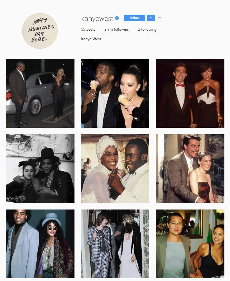 We’ve all been there: New to Instagram and obsessed with posting anything and everthing. No vague landscape or freshly brewed cup of coffee was safe from our grids. But the one person that we would assume to be overtly cool and limited in their ‘gramming is Kanye West. However, Yeezy recently re-activated his Instagram account to wish his wife, Kim Kardashian West, a happy Valentine’s Day.