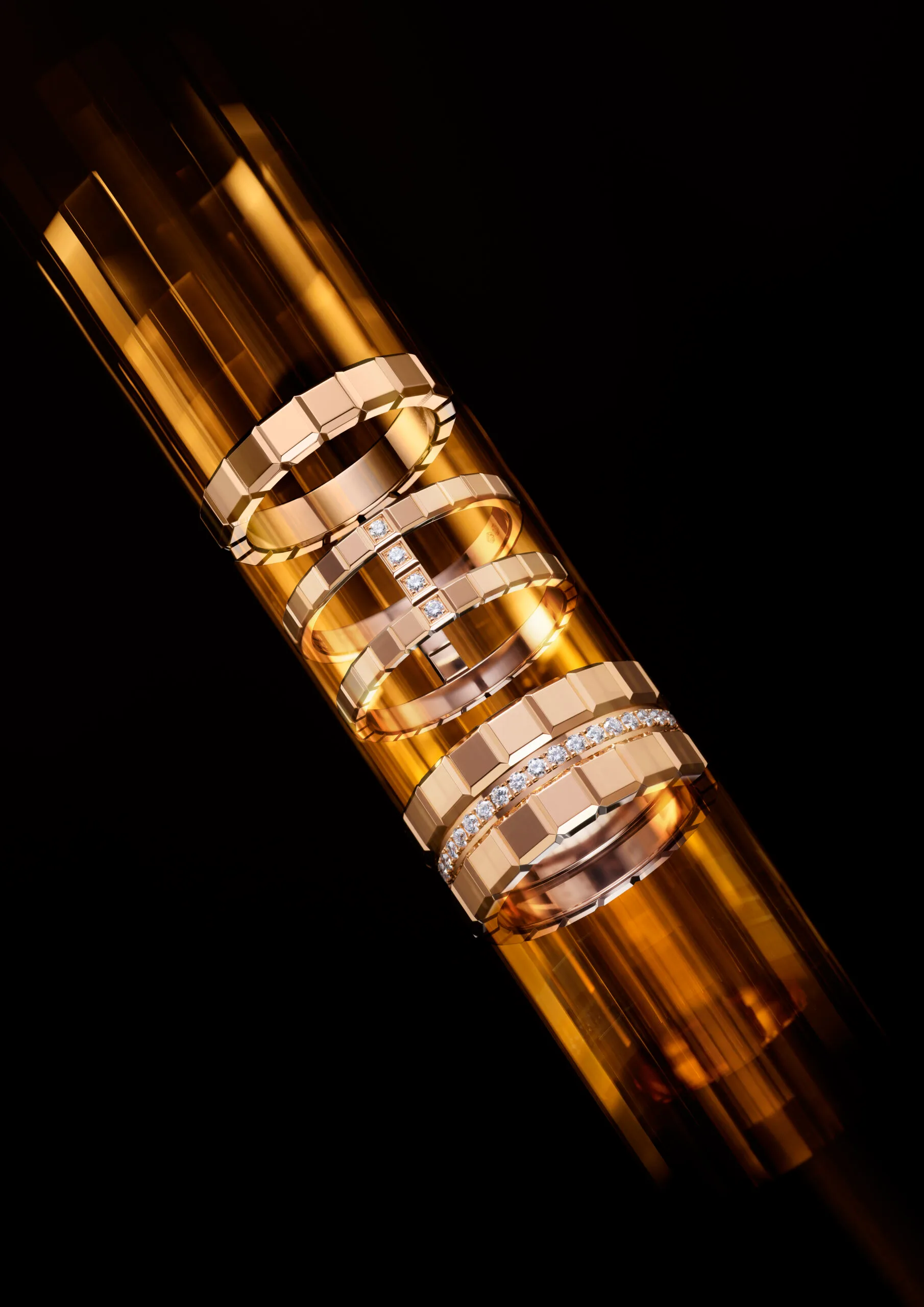 The sculptural, geometric design emblematic of the Ice Cube collection embodies a certain idea of urban elegance, from Paris to New York City via Shanghai and Seoul. Like the titanium armour of the Guggenheim Museum in Bilbao, which turns to liquid gold in the rain, Ice Cube is an architectural gem that plays with light.